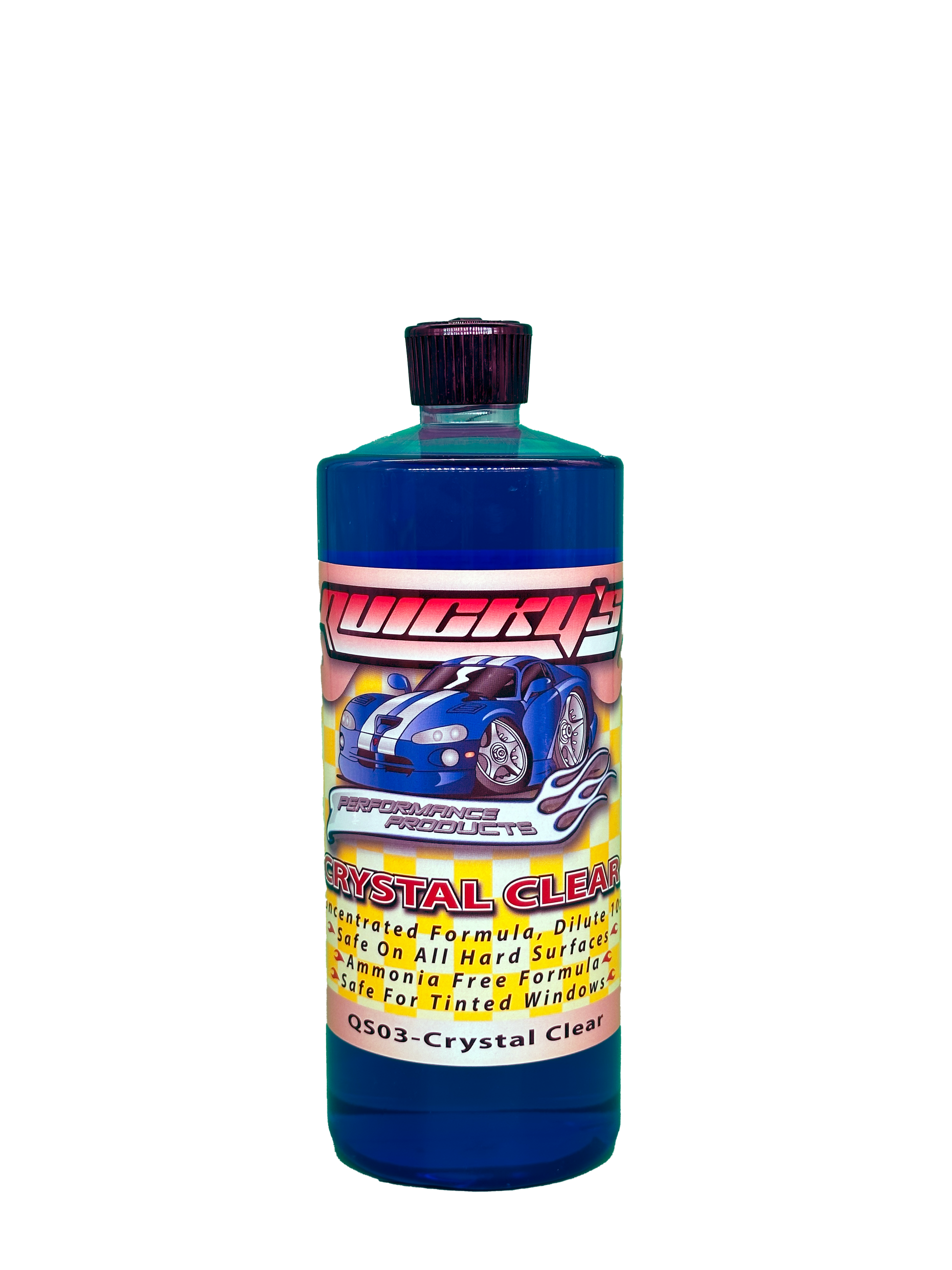Quicky's Crystal Clear RTU is a commercial grade glass cleaner that is made with specially formulated surfactants and cleaners. Crystal Clear is ammonia free and is safe for tinted windows. Dilute 10:1