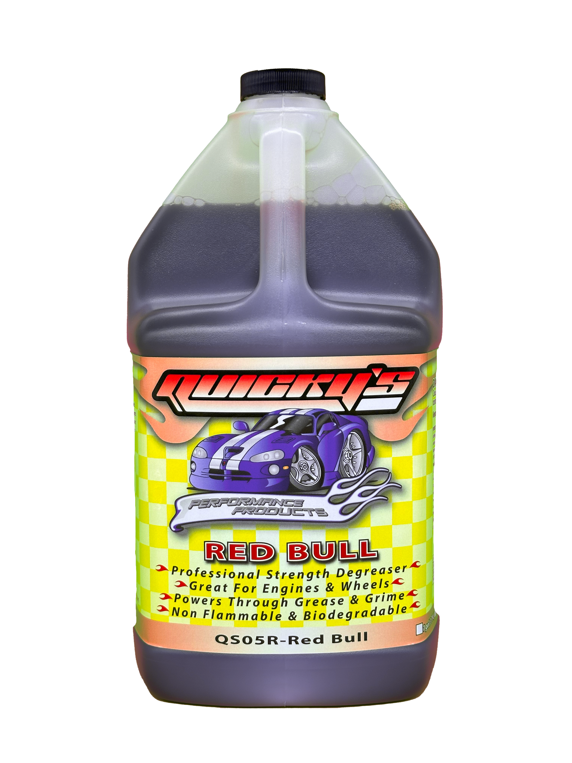 Quicky's Red Bull is a powerful heavy-duty degreaser that surpasses traditional cleaners with its unique formula of surfactants, wetting agents, emulsifiers and detergents. This concentrated solution effectively removes tough grease and grime, exceeding the performance of acidic cleaners, solvent degreasers and other water-soluble options and is safe to use on most surfaces without flashing. See Label for recommended dilution ratios, 4:1 for most surfaces, do not use stronger than 1:1.